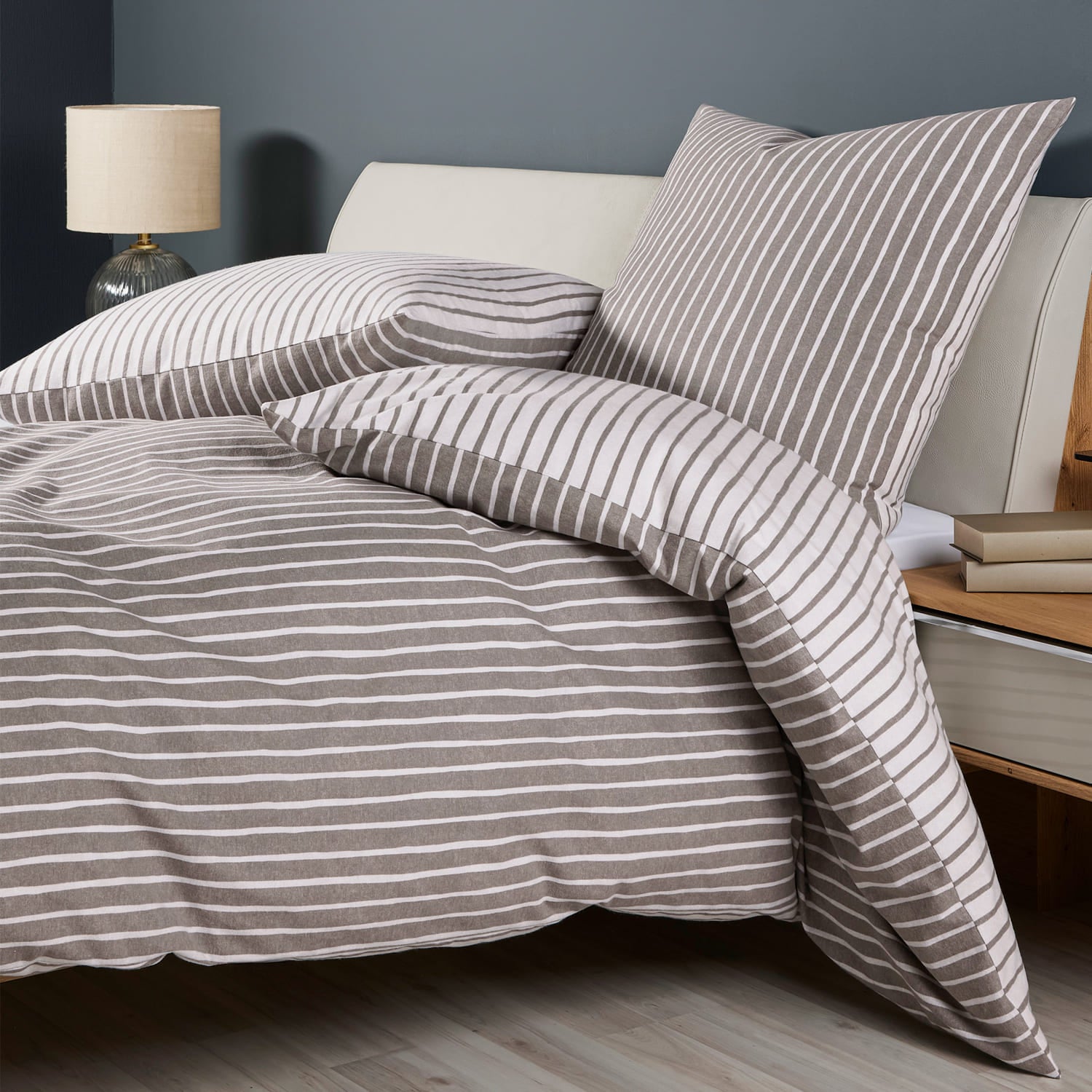 Sichern Sie sich die Janine Feinbiber Bettwäsche Davos 65170 Vulkan und erleben Sie Schlafkomfort der Extraklasse in der kalten Jahreszeit. Gefertigt aus 100% naturreiner Baumwolle in Janine-Spitzenqualität, bietet diese Feinbiber-Garnitur durch ihren hautsympathischen Rauhflor eine unübertroffene Wärmespeicherung und ist damit die perfekte Winterbettwäsche. Trotz ihrer wärmenden Eigenschaft bleibt das Material hoch atmungsaktiv und feuchtigkeitsregulierend, was für einen gesunden Schlaf sorgt. Ein echtes Highlight ist die moderne Streifenoptik im Farbton Vulkan, die durch die integrierte Wendefunktion zwei Looks in einem bietet. Die Bettwäsche ist durch die erstklassige Konfektion absolut formstabil, dauerhaft bei 60 Grad waschbeständig, bügelfrei und mit einem praktischen Marken-Reißverschluss ausgestattet. Die Öko-Tex Zertifizierung unterstreicht die hohe Qualität und Hautfreundlichkeit.