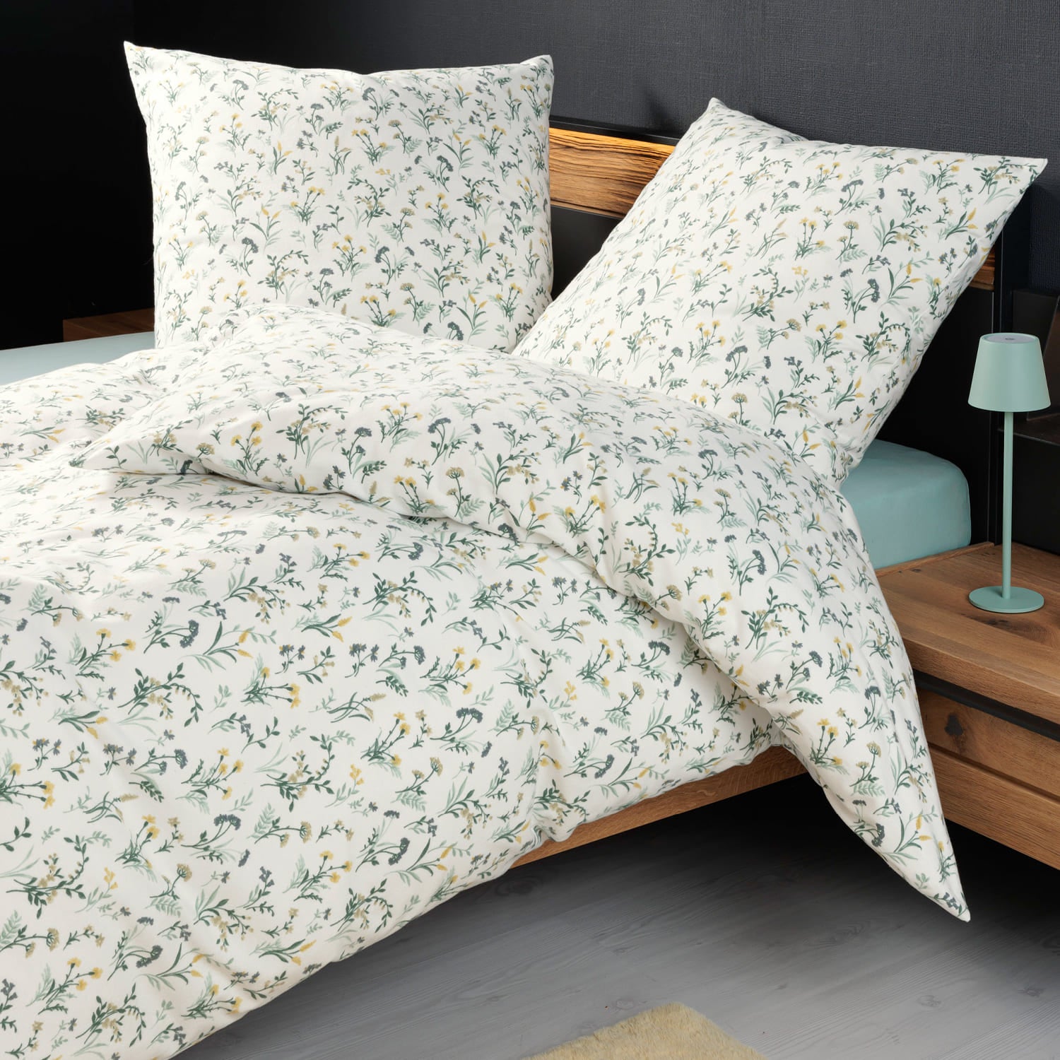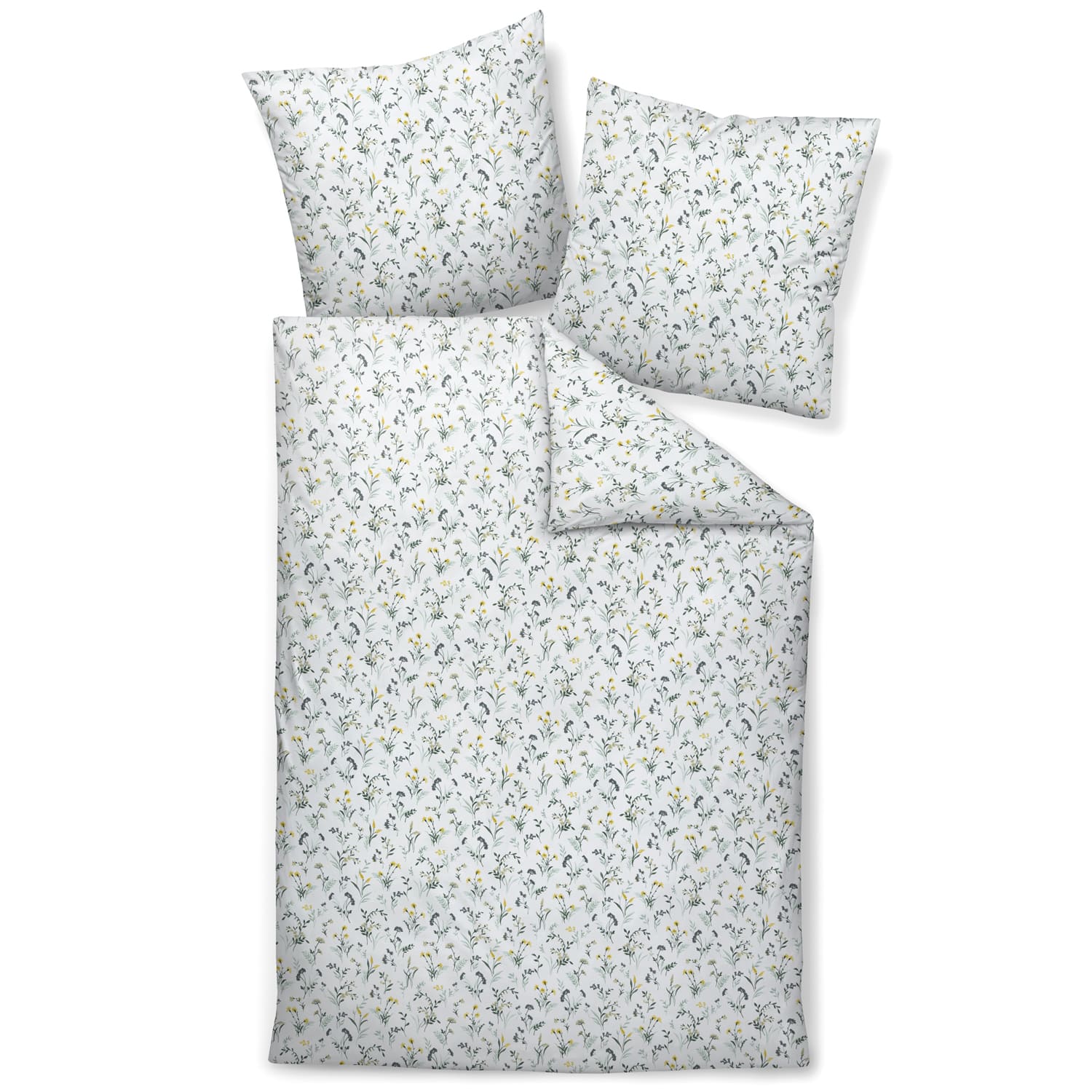 Entdecken Sie die Janine DAVOS Feinbiber Bettwäsche 65173 in der Farbstellung Salbeigrün Gelb. Diese Bettwäsche vereint modernes florales Design mit dem kuschelweichen Komfort der Janine-Spitzenqualität – perfekt für die Wintermonate. Das Dessin besticht durch bunte, fröhliche Blumenmotive auf hellem Grund, welche eine entspannte und einladende Atmosphäre schaffen.